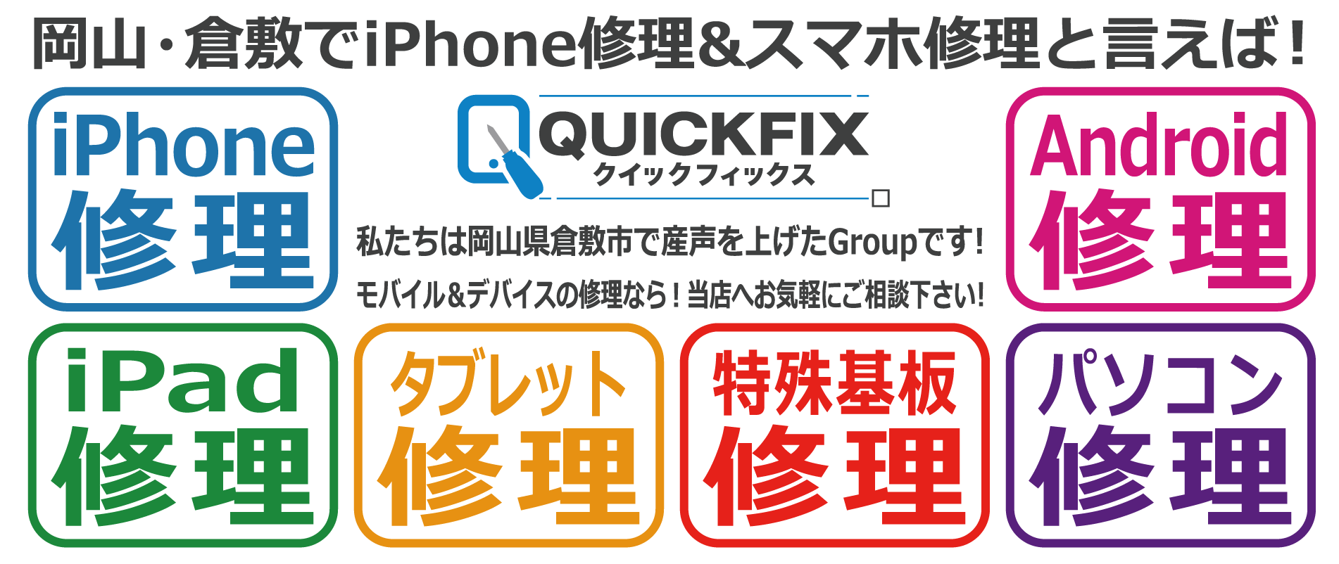 岡山でiPhone修理&スマホ修理と言えば!QUICKFIX(クイックフィックス)岡山駅前店では、各種不具合修理を『地域最安値級の料金』『データが消えない』『即日対応』で行っています!